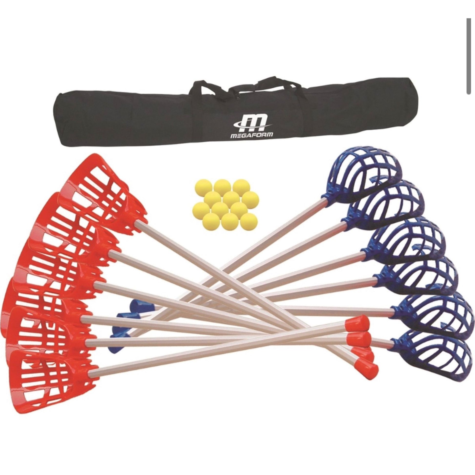 Durable and safe Lacrosse set. Sticks with light aluminium shaft and unbreakable soft TPU head making them easier to handle for young children. Total stick length: 100cm. Stick weight: 370g. Set composed of 6 red sticks, 6 blue sticks, 12 balls (7,2cm) and one convenient transport bag.