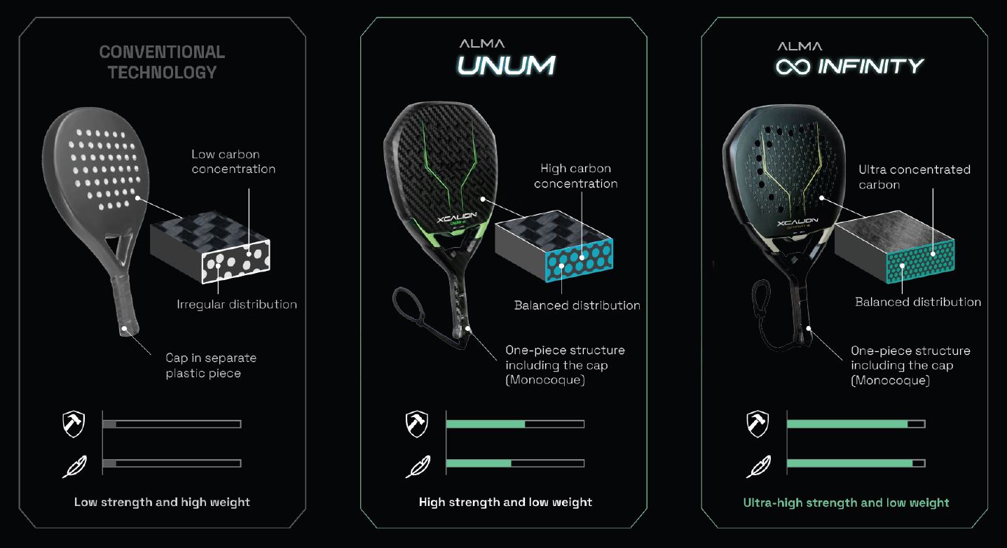 It is the lightness and strength of ALMA material taken to the extreme - into infinity. INFINITY is an expanded carbon square, pushed to the limit, covering the entire racket. It delivers the highest carbon density. Its maximum concentration creates a visually unique effect. INFINITY achieves the highest levels on the market in both durability and lightness. INFINITY takes the concept of K to infinity - without material limits, its development is endless.