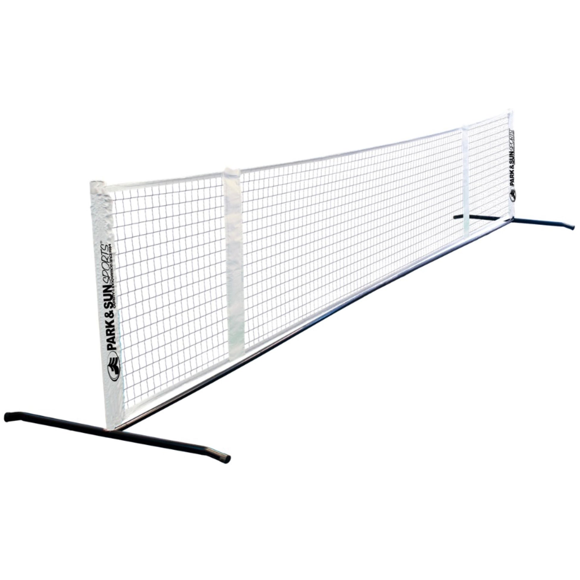 Pickleball vai tenisa spēle ceļo kopā ar jums, pateicoties šim pārnēsājamajam pickleball komplektam. Uzstādiet pickleball vai tenisa spēli jebkurā vietā ar līdzenu virsmu. Šis ātrais un vienkāršais, īpaši pārnēsājamais tenisa tīkls ir lieliski piemērots treniņiem vai draudzīgai spēlei. 81 cm garais tīkls iet pāri metāla rāmim, izmantojot vieglas sānu piedurknes, un tam ir labi pamanāma augšējā lente un viegli nospriegotas siksnas. Regulējamais 6,4 m tīkls (plus 10 cm platas piedurknes katrā pusē) ir regulējams līdz 5,5 m un 4,6 m garumam, lai to izmantotu mazākos spēļu laukumos. Atbalsta rāmis ir izgatavots no izturīga cauruļveida metāla un sastāv no 6,4m šķērsstieņa un diviem 3cm (dia.) x 91,44cm (h) gala balstiem.